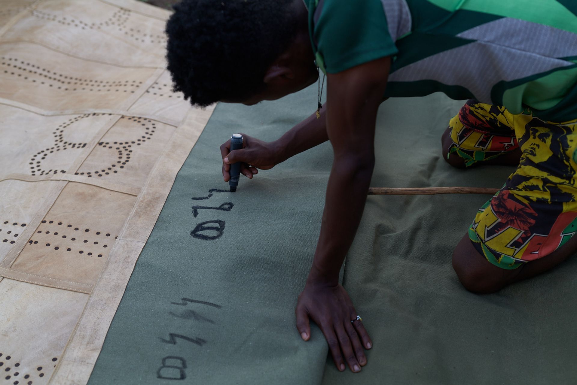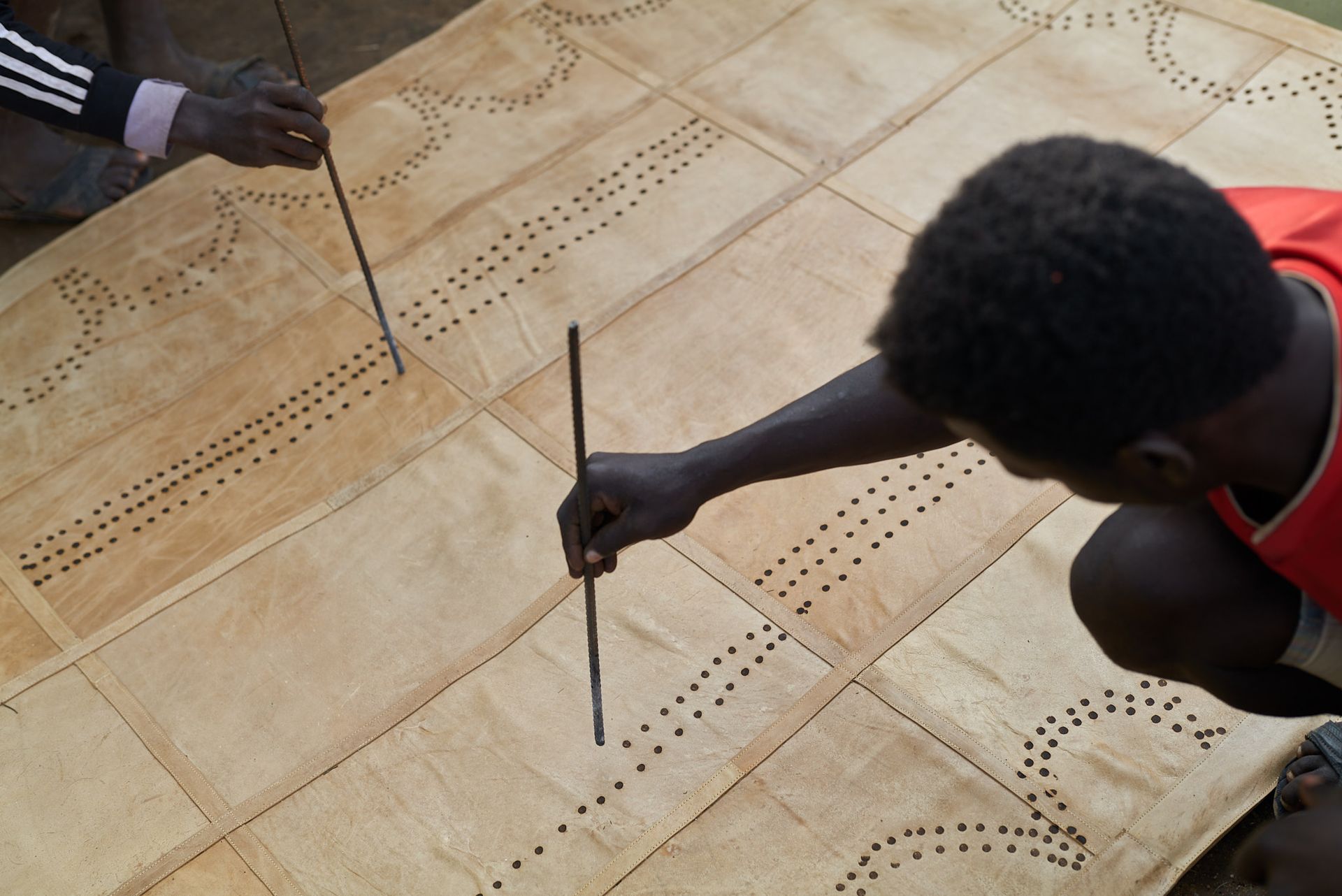 Woven with skill and precision, this leather rug & wallhanging by Wegeneye Ermyaso is a testament to the rich heritage of the Ari Tribe. Utilizing steel and wood poles, Ermyaso has burned intricate patterns into the leather, reflecting the tribe's unique body art traditions.